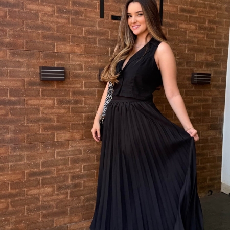 O vestido é inteiramente forrado, garantindo conforto e segurança.