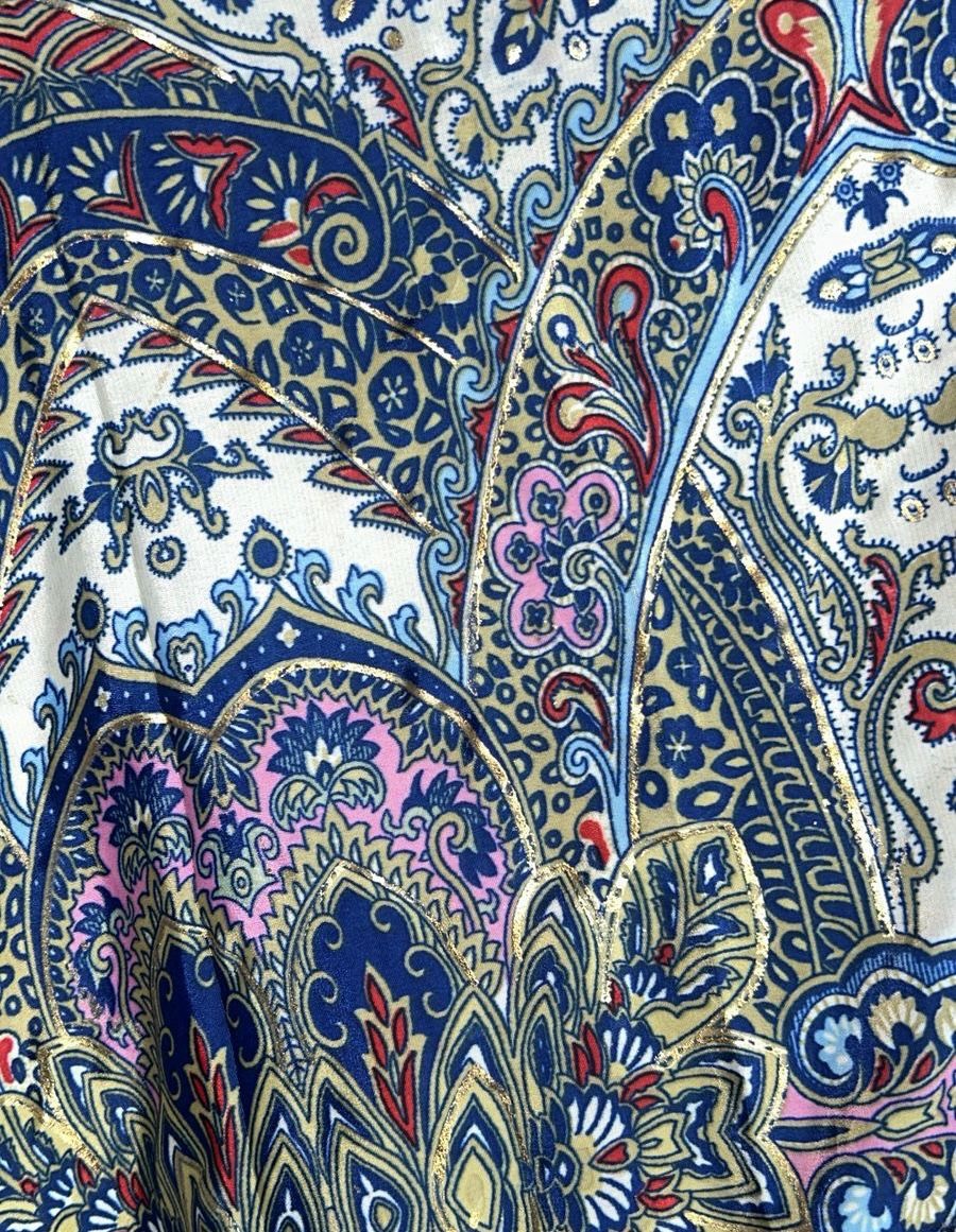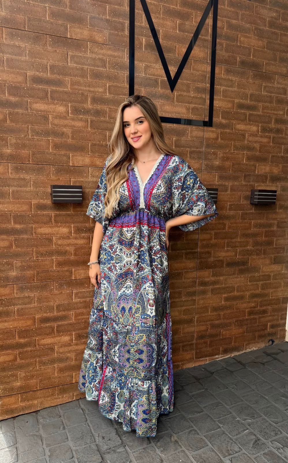 Vestido longo estampado, tecido com toque frio, leve brilho no tecido, mangas amplas, modelagem fluida e decote com bordado.