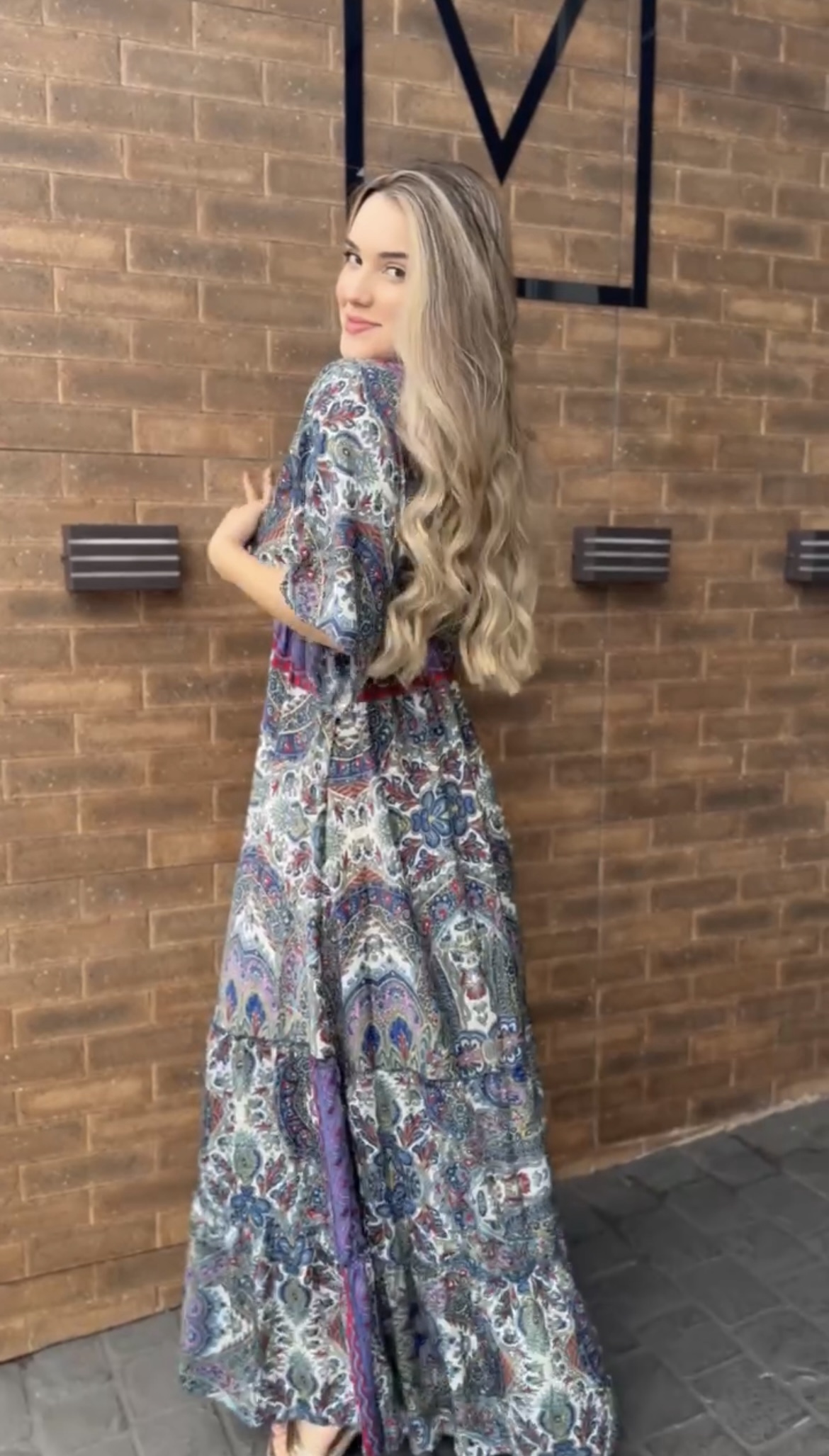 Vestido longo com modelagem fluida que proporciona leveza e elegância ao vestir. Confeccionado em tecido com toque frio, semelhante à seda, possui estampa sofisticada com leve brilho no tecido. O decote apresenta delicado bordado.