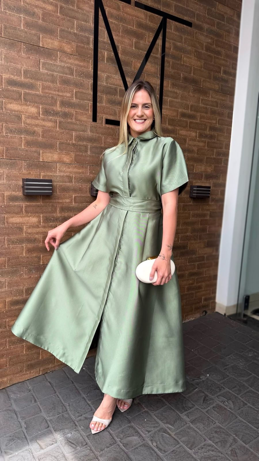 O modelo maximidi apresenta gola clássica e botões frontais, trazendo um toque atemporal e refinado à peça. As mangas curtas oferecem conforto e praticidade, enquanto a faixa no mesmo tecido permite amarração na cintura, valorizando a silhueta de forma delicada. A saia com modelagem evasê proporciona movimento e leveza, equilibrando estrutura e feminilidade.